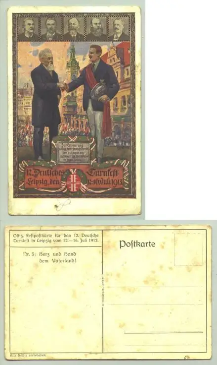 Artikelbeschreibung u. Zustand : Siehe Scan / Gebrauchsspuren, fleckig. Weitere Infos : Ansichtskarte. Offizielle Festpostkarte fuer das 12. Deutsche Turnfest in Leipzig vom 12.-16.Juli 1913. Karte Nr. 5 : Herz und Hand dem Vaterland ! Farbige Kuenstlerzeichnung von Liebing