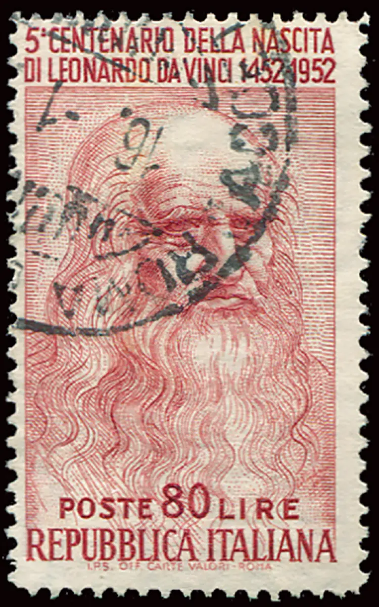 Leonardo da Vinci Lire 80 weißes Papier, dent. 13,1/4 x 13 GEBRAUCHT - Leonardo da Vinci Lire 80 Nr. 688 weißes Papier, gezahnt 13,1/4 x 13 - sehr gutes Exemplar gut gestempelt, normal zentriert - Selten - D. Carraro - Kat. 400 Cod. 434/15