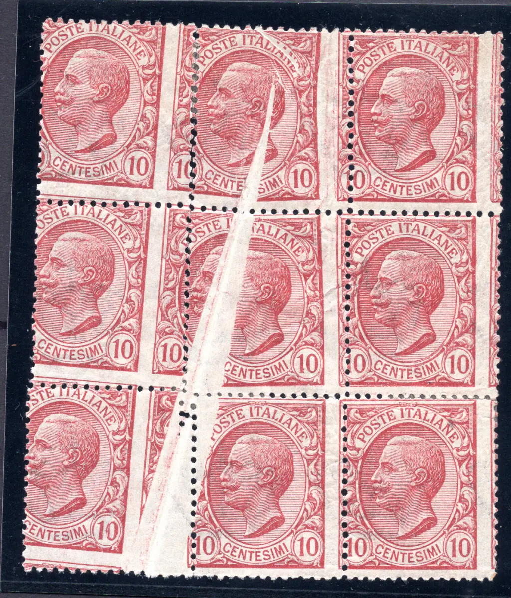 MH Linguellato - Leoni Cent. 10 n. 82-jähriger schöner Block von neun Exemplaren mit breiter Papierfalte vor Druck und Stanzung - Die drei linken Marken mit stark in beide Richtungen verschobener und gedrehter Verzahnung (Nr. 82ne) - auffällig und selten, perfekt mit Linguella auf allen Exemplaren - Katalogbewertung über 1.200 Euro Katalog 1200 Euro Cod.2136/WEB