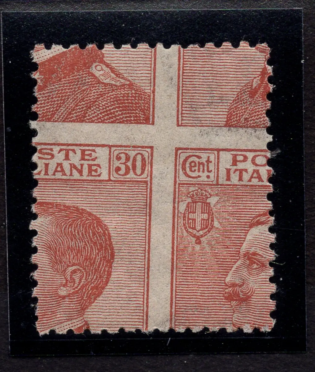 MNH - Vollgummi - Löwen Cent. 15 n. 108k Viertelblattrand mit vertikaler Stufenverzahnung und stark verschobener horizontaler Verzahnung über 10mm. - Seltene, nicht katalogisierte Sorte, neuer perfekter Vollgummi Cod. 3334/WEB