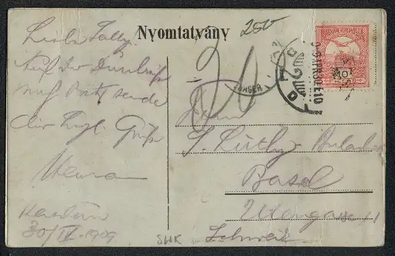 Personenbezogene Daten auf der Rückseite der Karte wurden durch blauen Textmarker unkenntlich gemacht. Die blauen Stellen sind auf die Vorderseite durchgeweicht und wirken sich negativ auf das Postkartenfoto aus