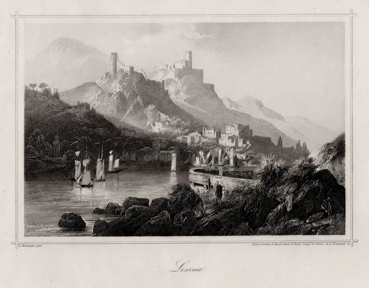 Lesina in Dalmatien. Insel Hvar, echter Stahlstich um 1850