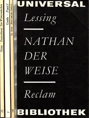 die Seiten sind altersbedingt gebräunt, der Einband fleckig, gute Exemplare, Reclams Universal-Bibliothek Band 3, 33. Auflage: Nathan der Weise - Redams Universal-Bibliothek Band 148, 17. Auflage: Mario und der Zauberer - Reclams Universal-Bibliothek Band 1, 31. Auflage: Faust, Tragödie erster Teil - Reclams Universal-Bibliothek Band 22, 34. Auflage: Ein Wintermärchen Beschreibung vom Antiquariat Ardelt 3d2a Antiquariat Ardelt