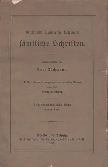 Lessing - Lachmann, Karl (Hrsg.): Gotthold Ephraim Lessings sämtliche Schriften. Zweiundzwanzigster Band. Erster Teil.