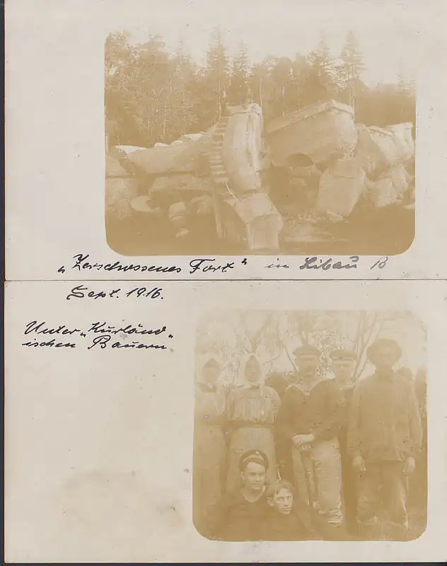 Libau Liep?ja 1916 zwei Fotokarten "Unter kurländer Bauern, Zerschossenes Fort", rs. Unbeschrieben