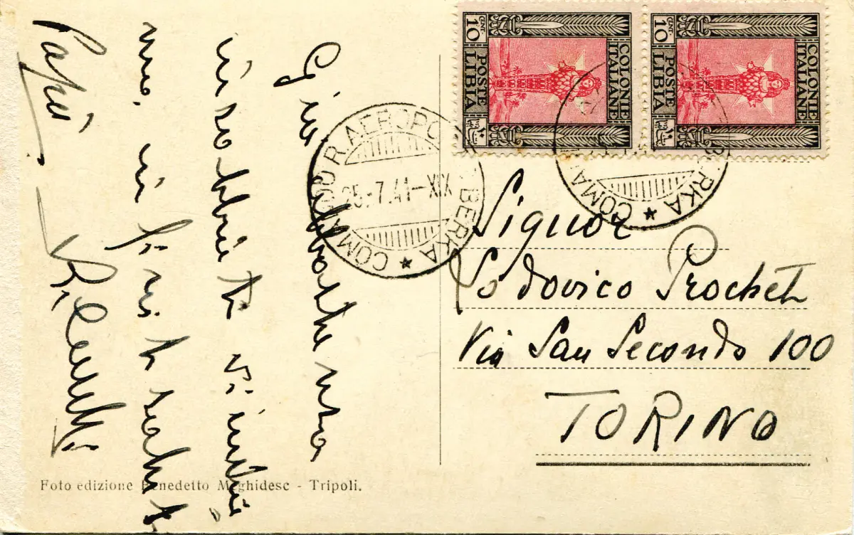 Libyen - Kommando R. Flughafen Berka Guller Annullator - Postkarte AK - Libyen - Kommando R. Flughafen Berka Guller Annullator - Ansichtskarte direkt nach Turin am 25.7.41 frankiert mit Cent-Paar. 10 Nr. 47 - deutlich aufgedruckter Wertstempel Cod. 1154/14