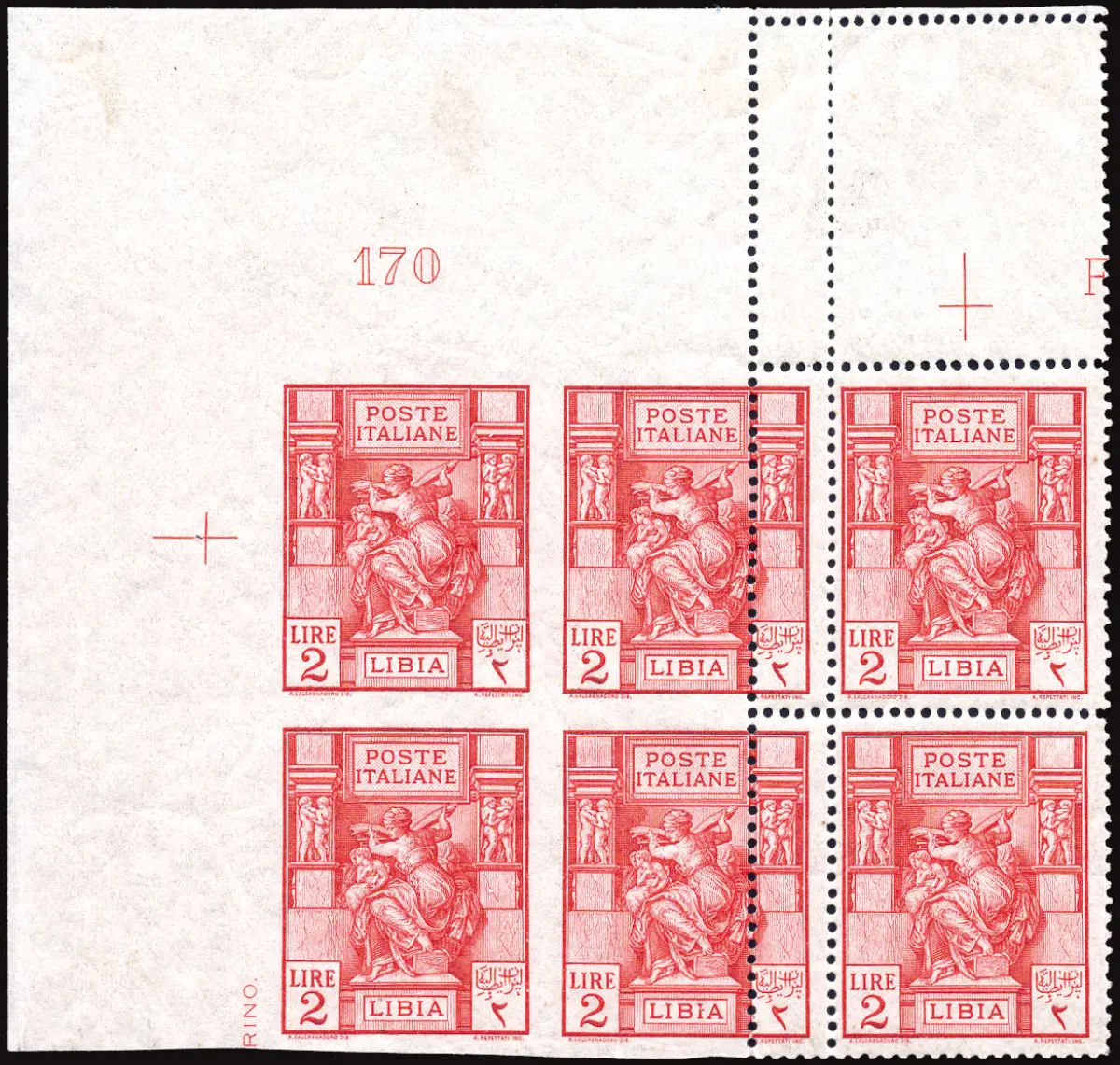 MNH - Vollgummi - - Libyen - Sibylle Lire 2 Nr. 43b wunderschöner Sechserblock a. von f. mit Tischnummer 170 enthält neben zwei ungezahnten Exemplaren zwei horizontale Paare mit rechts einem regelmäßig gezahnten Exemplar und mit stark nach rechts verschobener linker Verzahnung (mm. 18) - siehe bekannter sächsischer Katalog - es handelt sich zweifellos um eine der größten Raritäten dieser Ausgabe - Kat. euro 19.500 Cod.1045/182