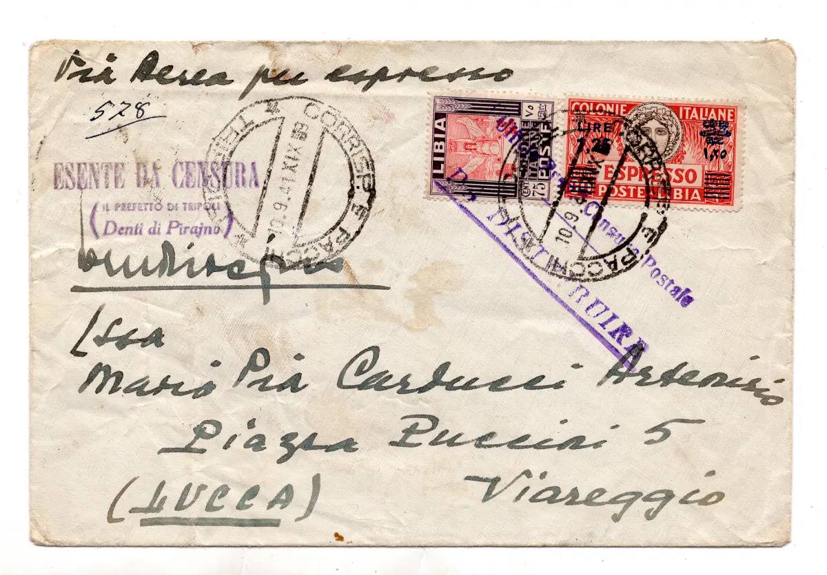 - Libyen - Espresso Nr. 17 + komplementäre P.O. Nr. 104 auf Luftumschlag exp. von Tripolis nach Viareggio am 10.9.41 - seitlich und hinten interessante Ann. der Zensur Zu verteilen - Interessante Nr. 978/18