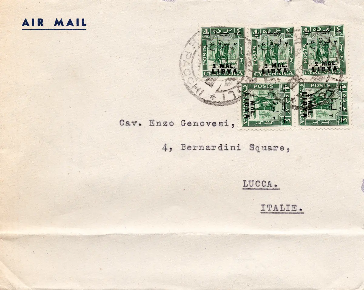 Umschlag - Unabhängiges Königreich Libyen - Ausgabe für Tripolitanien Ritter Senussita 2 Mal. auf 4 m. Nr. 25 fünf Exemplare auf Luftumschlag von Tripolis nach Lucca am 17.3.52 - Umschlag unten gefaltet, perfekte Briefmarken - Selten - hoher Katalogwert Cod. 1093/17