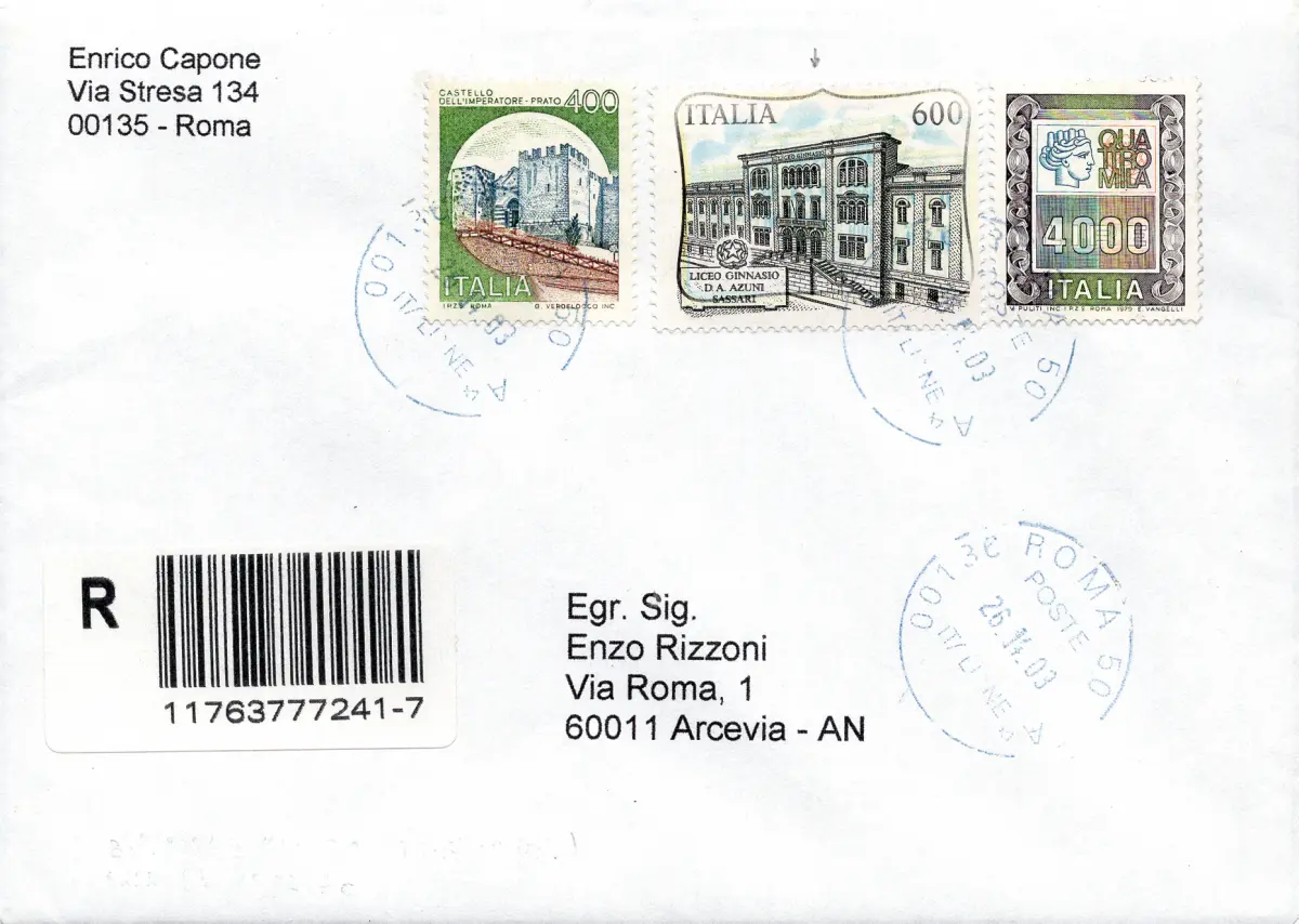 Umschlag - Liceo di Azuni Lire 600 Nr. 1965 Azuni grau auf eingeschriebenem Reiseumschlag mit Zusatzfrankatur (Sass. spec. n. 1597Ab, Bolaffi Nr. 2086B) - im Tarif - Seltene postalische Verwendung der Naturmarke Cod. 906/17