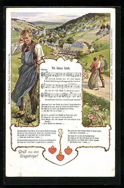 Lied-AK De biese Lieb, Lied in erzgebirgischer Mundart, ein Mann weint, weil seine Liebste mit einem anderen geht