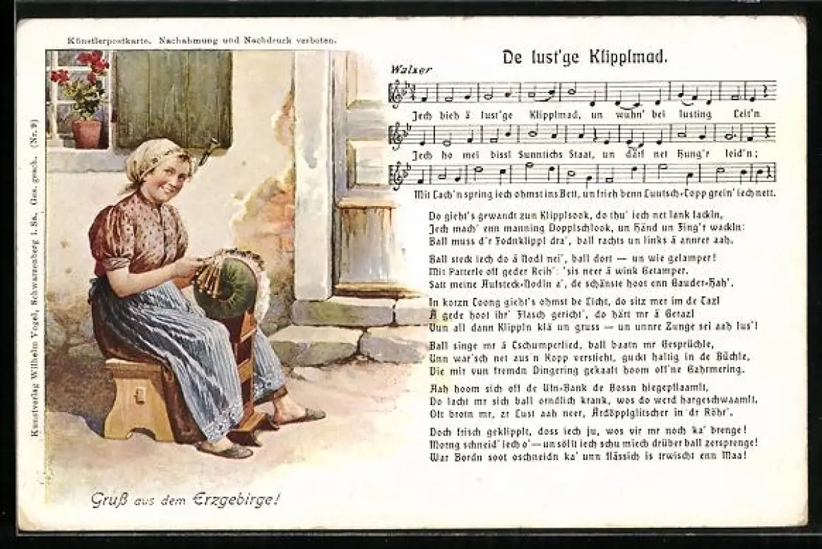 Lied-AK De lust'ge Klipplmad, Bäuerin in Tracht
