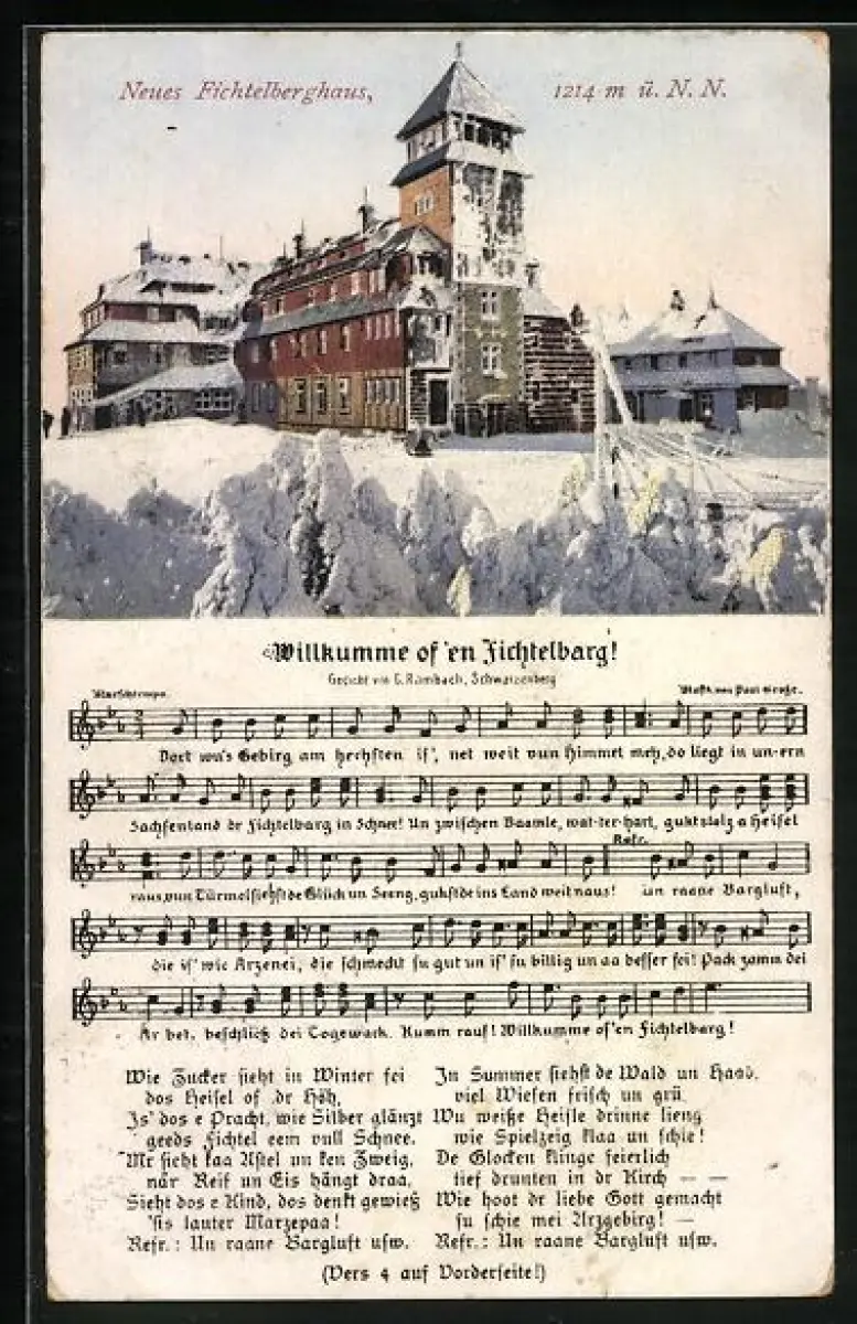 Lied-AK Willkumme offen Fichtelbarg, Lied von C. Rambach u. Paul Grosse, das Neue Fichtelhaus, Winteransicht