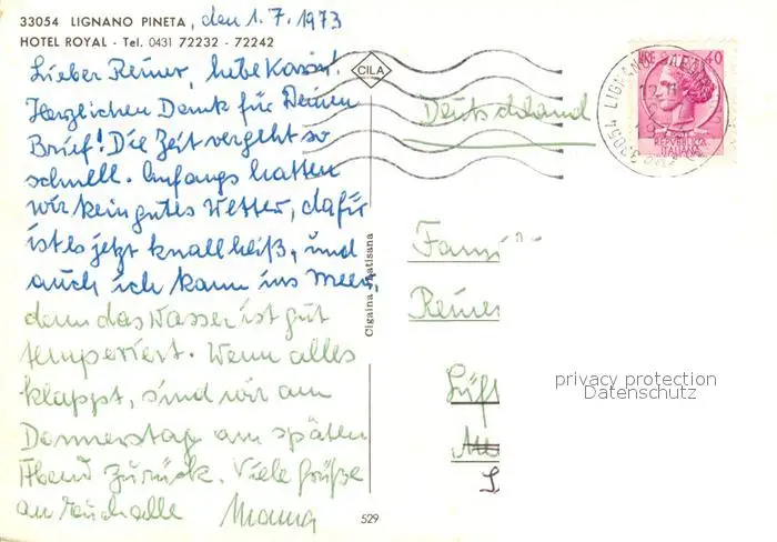 Lignano_Pineta Hotel Royal Lignano Pineta postalisch gelaufen 1973 Erhaltung siehe scans [PaolaD17] PaolPID1
