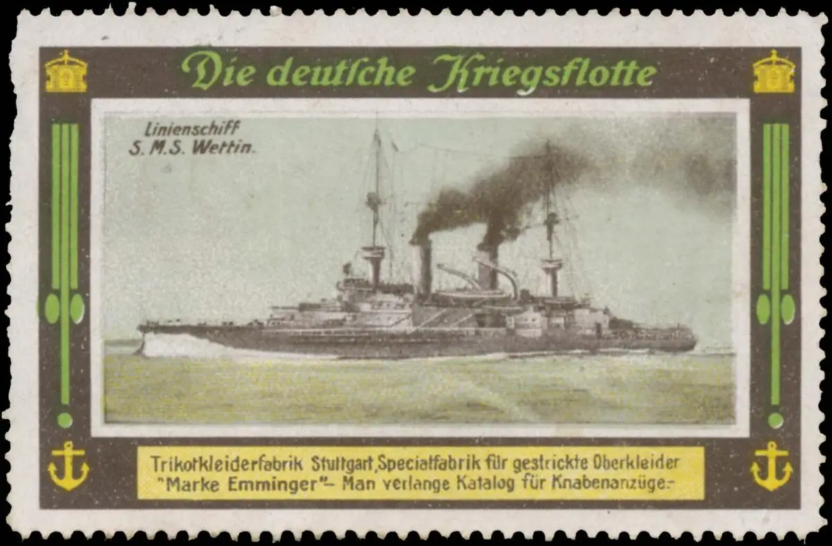 "Die deutsche Kriegsflotte, Marine-Reklamemarken ""Deutschlands Kriegsflotte"", 48 Kriegsschiffe in 6 Serien sind in Strumpf-Wollmanufakturwaren- und Konfektionsgeschäften, welche gestrickte Oberkleider ""Marke Emminger"" führen, zu haben.", Größe/Zustand: 4x7 , guter Zustand, Original alte Reklamemarke die seinerzeit für die Werbung benutzt wurde