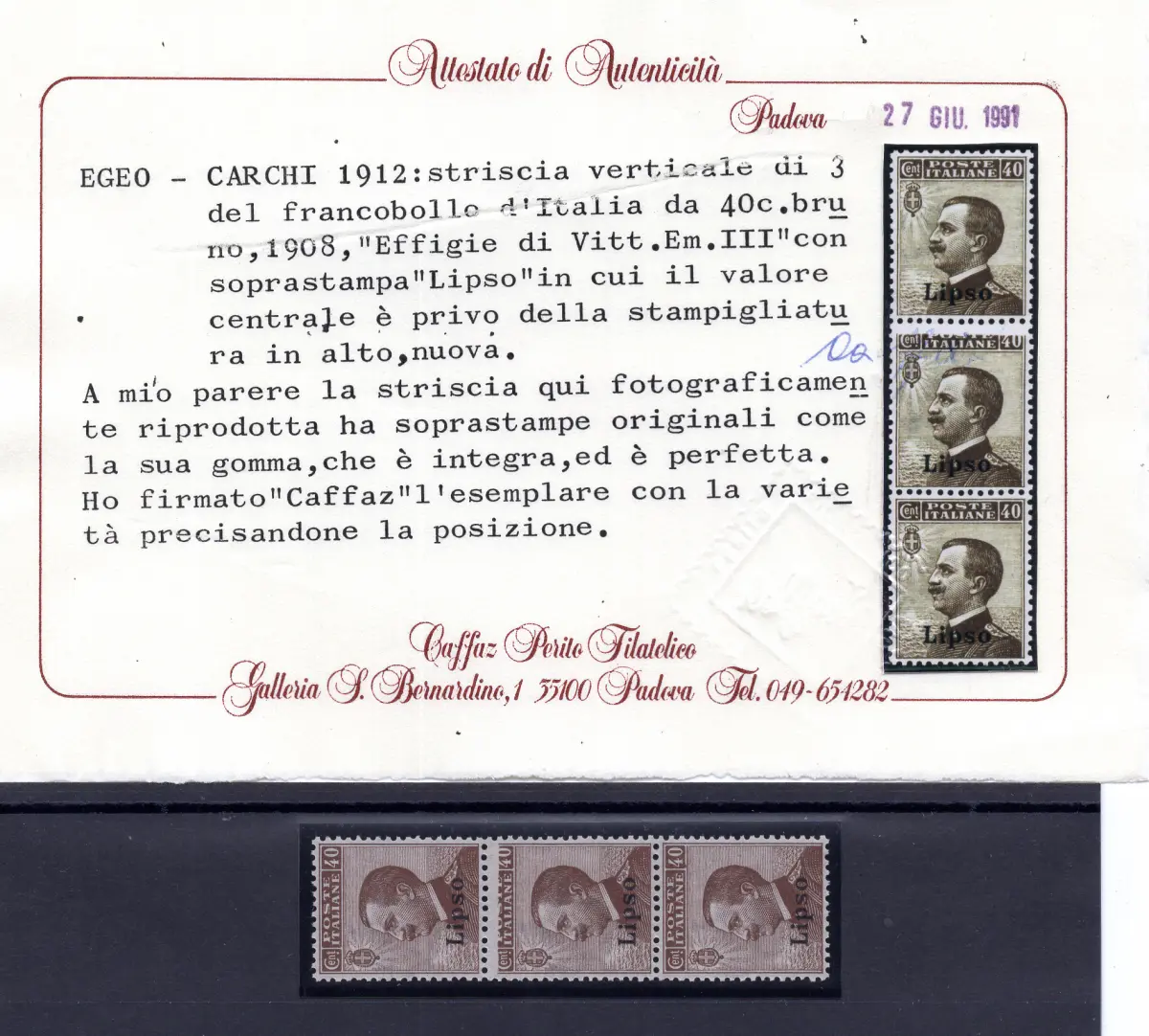 MNH - Vollgummi - - Lipso - Michetti Cent. 40 n. 6b vertikaler Dreierstreifen mit dem Mittelwert ohne Druck oben, perfekt neu mit Vollgummi - Caffaz Zertifikat Cod. 2704/WEB