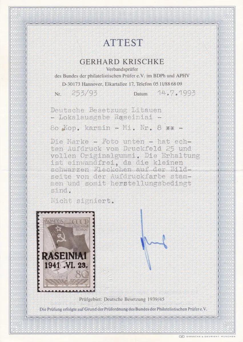 Litauen: Raseiniai, MiNr. 8, **, BPP Attest