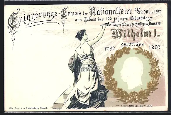 Lithographie 100. Geburtstag von Kaiser Wilhelm I., 22.3.1897, Portrait mit Eichenlaub