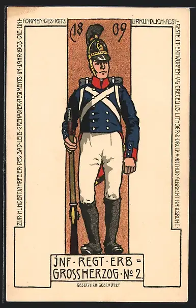 Lithographie 100 Jahrfeier des Bad. Leib-Gren.-Regts 1903, Inf. Regt. Erb-Grossherzog No. 2, Uniform 1809