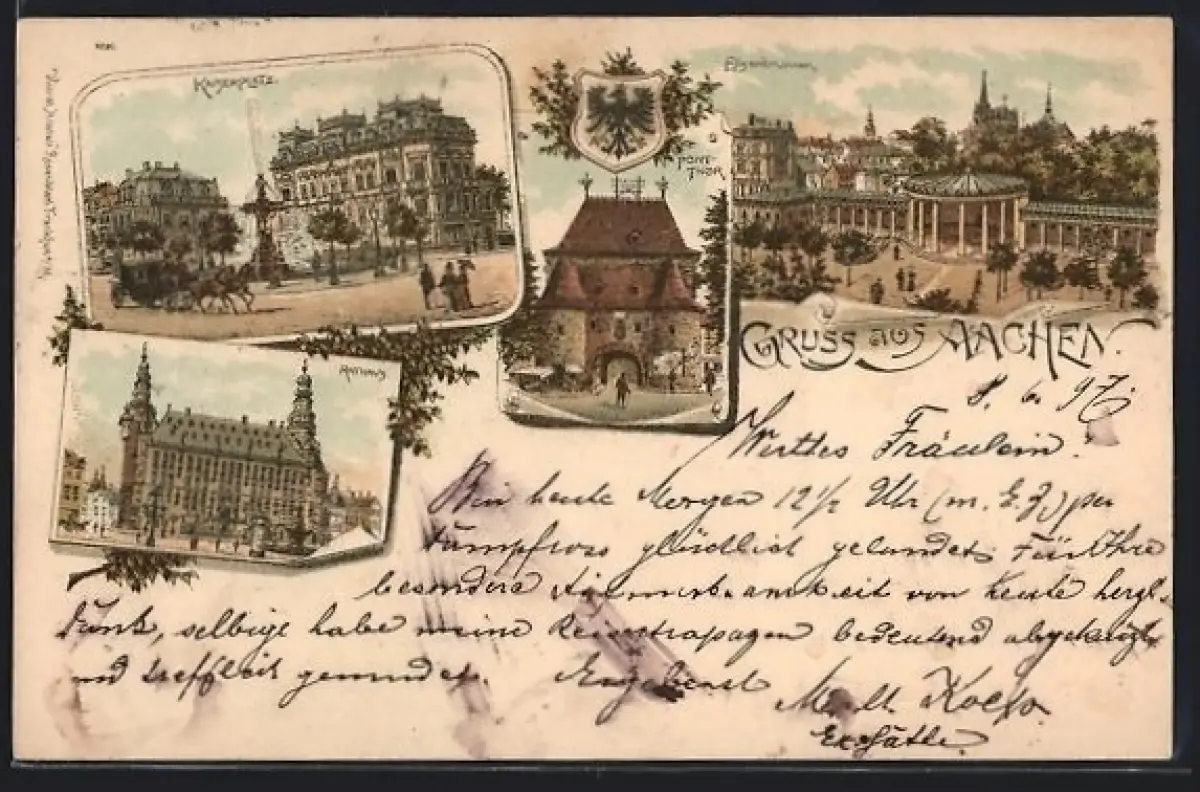 Lithographie Aachen, Kaiserplatz, Rathaus