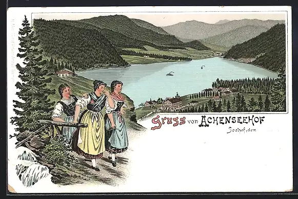Lithographie Achenkirch, Achenseehof, Frauen in Tracht blicken auf den Ort und See