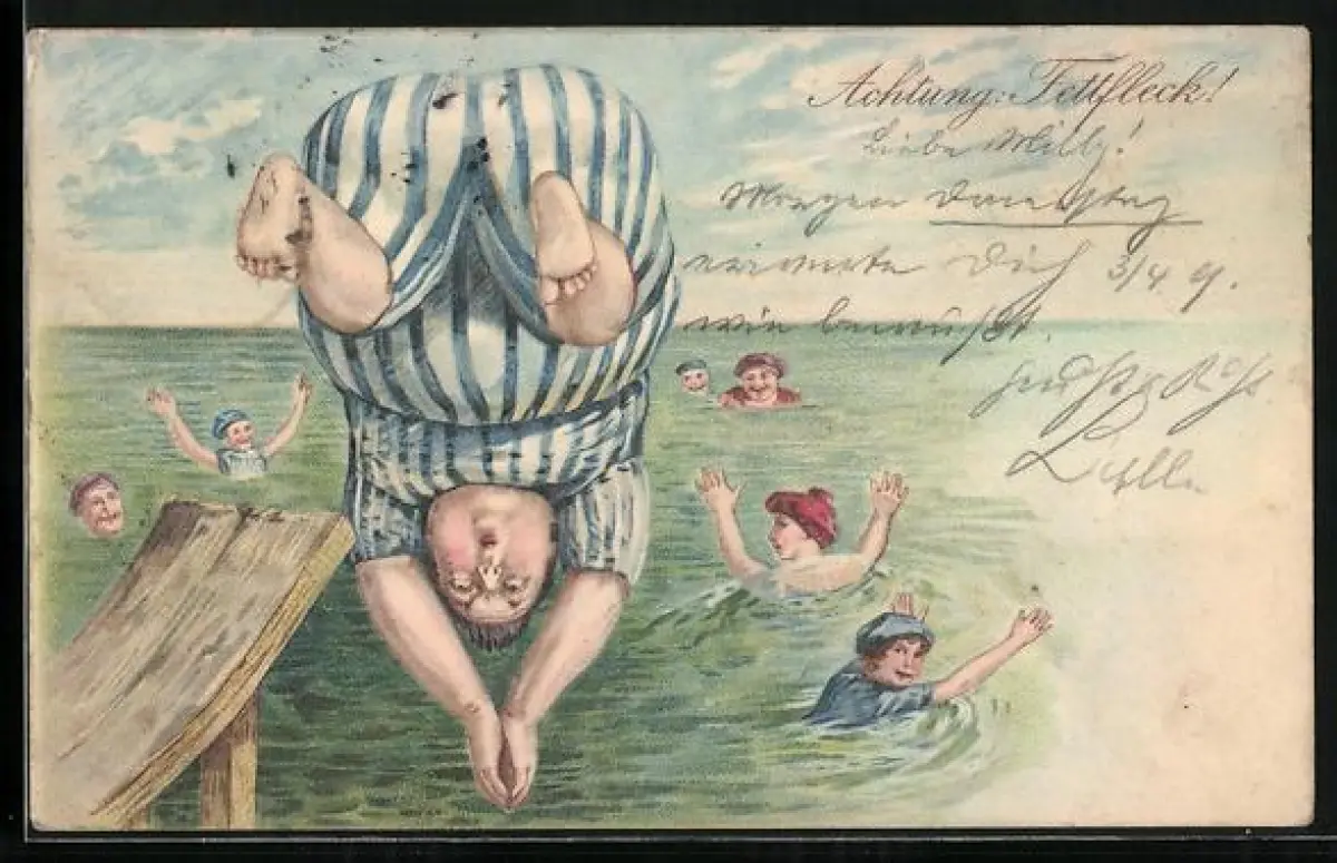 Lithographie Achtung Fettfleck, korpulenter Herr in Bademode springt ins Wasser