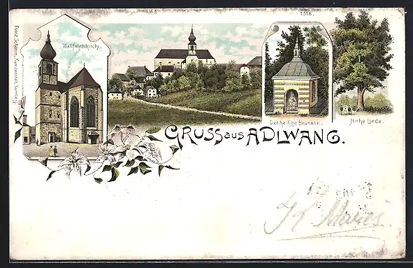 Lithographie Adlwang, Wallfahrtskirche, Der heilige Brunnen, Hohe Linde, Ortsansicht