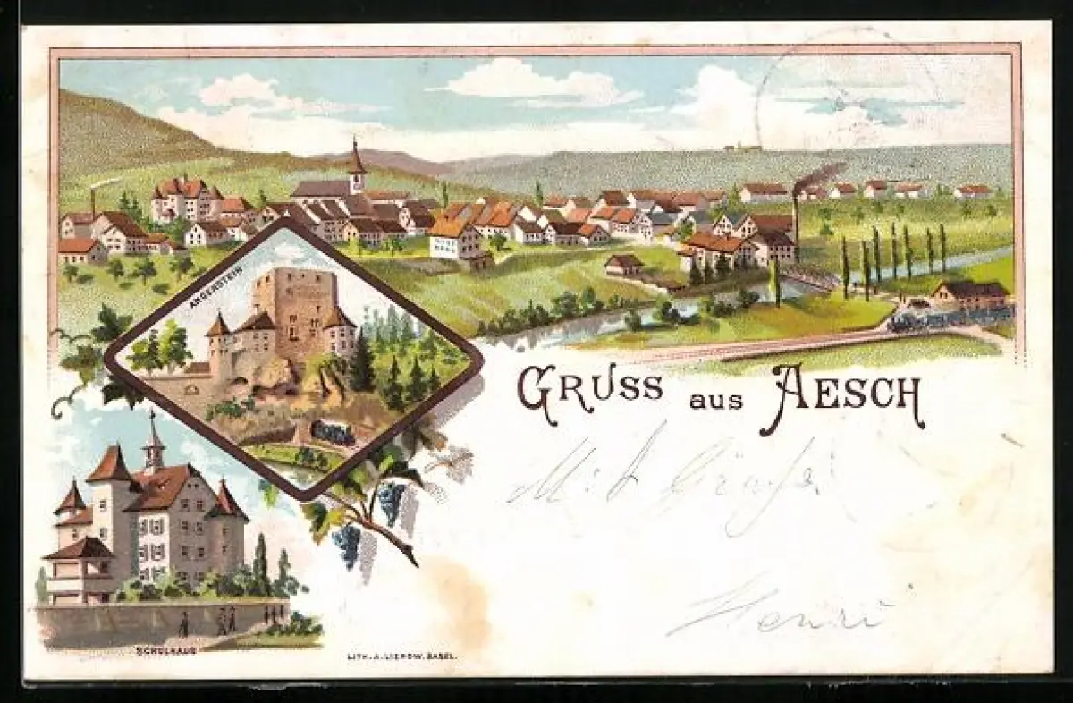 Lithographie Aesch /BL, Schulhaus, Angenstein, Ortspanorama
