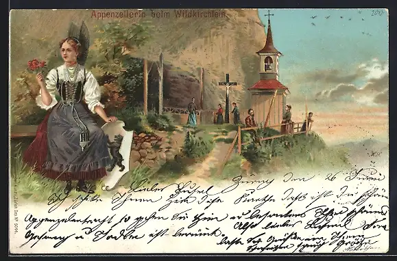 Lithographie Aescher-Wildkirchli, Appenzellerin beim Wildkirchlein