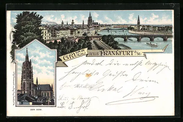 Lithographie Alt-Frankfurt, Ortsansicht mit Brücke, Dom