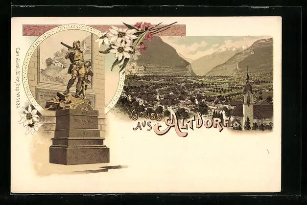 Lithographie Altdorf, Teilansicht mit Kirche, Wilhelm-Tell-Denkmal