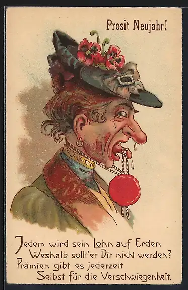 Lithographie Alte Frau mit versiegelter Zunge, Neujahrsgruss