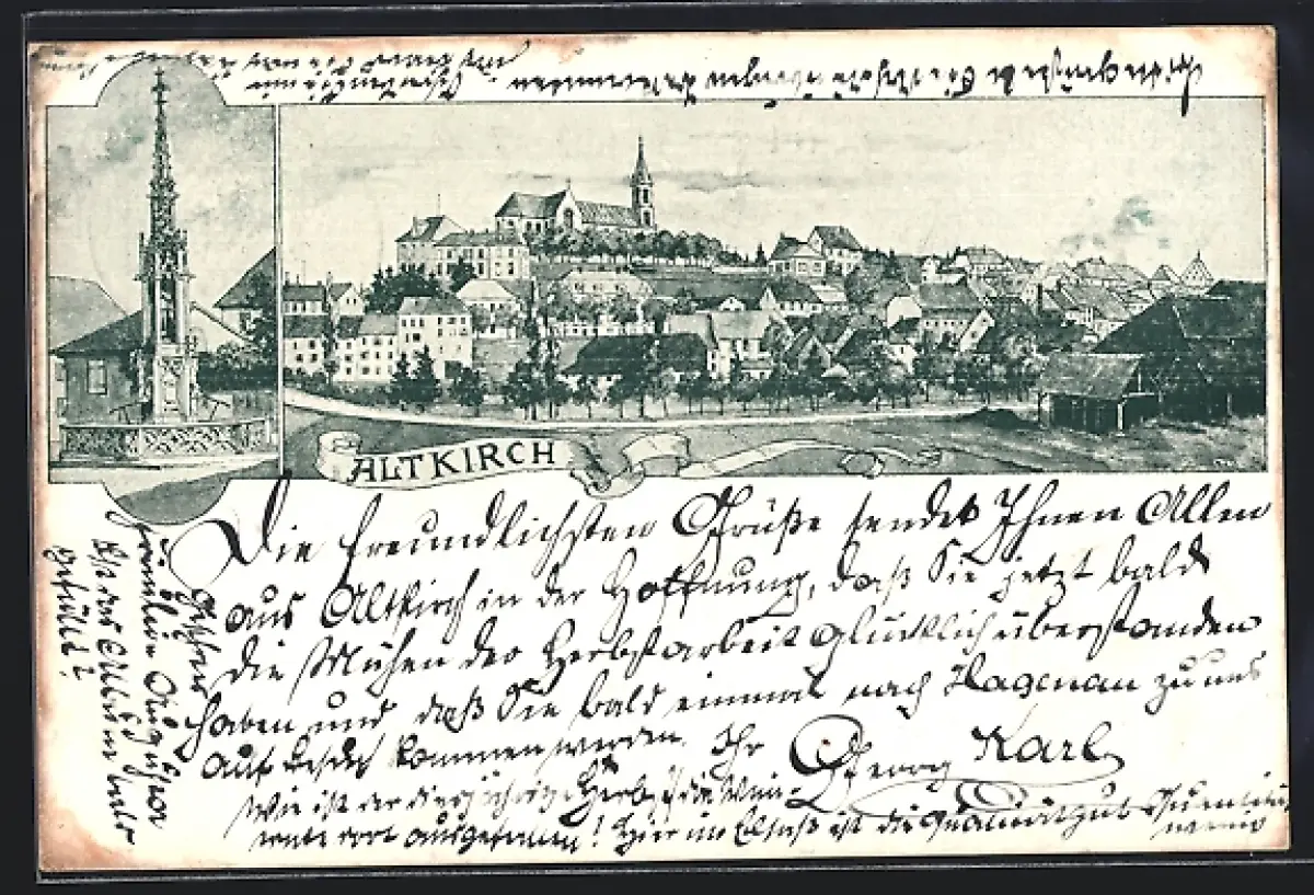 Lithographie Altkirch, Teilansicht mit Kirche, Brunnen