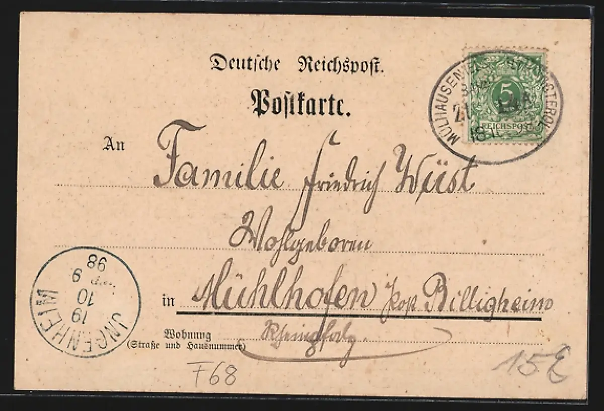 Personenbezogene Daten auf der Rückseite der Karte wurden durch blauen Textmarker unkenntlich gemacht. Die blauen Stellen sind auf die Vorderseite durchgeweicht und wirken sich negativ auf das Postkartenfoto aus