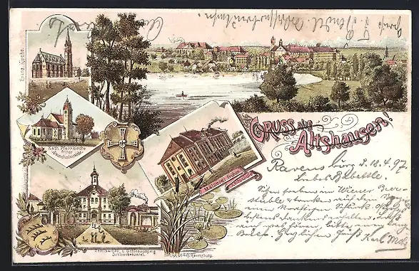 Lithographie Altshausen, Mälzerei, Kath. Pfarrkirche, Evang. Kirche