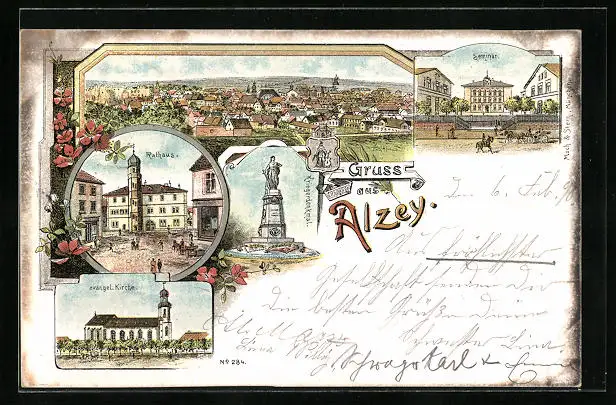 Lithographie Alzey, Rathaus, Seminar, Kriegerdenkmal