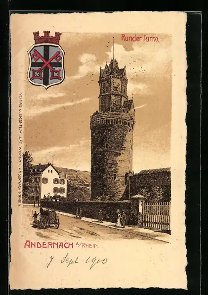 Lithographie Andernach a. Rh., Runder Turm mit Strassenpartie