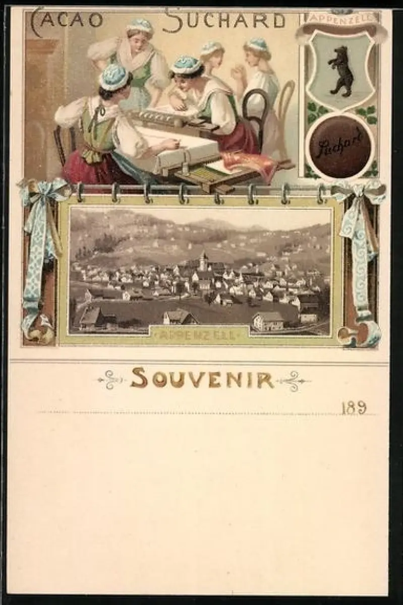 Lithographie Appenzell, Panoramablick auf den Ort, Blick in eine Webstube, Reklame für Cacao Suchard