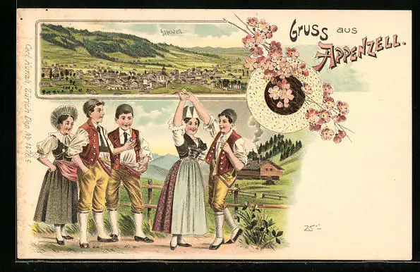 Lithographie Appenzell, Teilansicht, Tanzpaar in Tracht