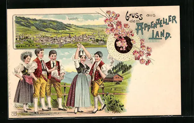 Lithographie Appenzell, Totalansicht, Kinder in Trachten
