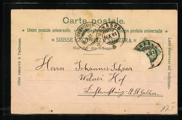 gelaufen 1901, Eckknick unten li., Briefmarke entfernt, guter Zustand