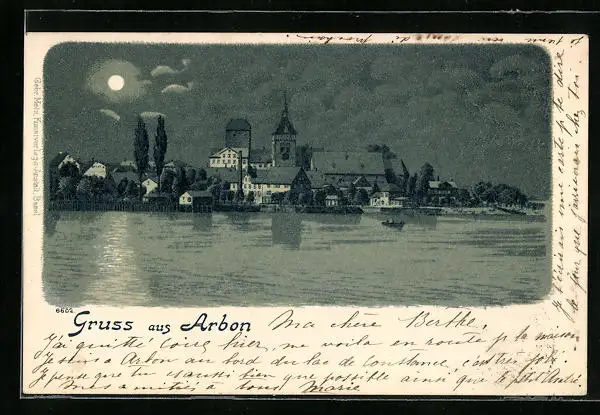 Lithographie Arbon, Teilansicht im Mondschein
