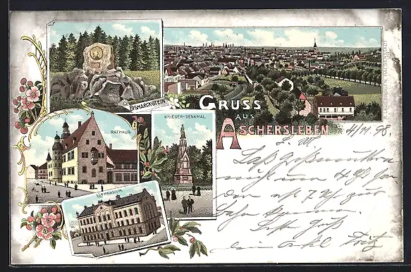 Lithographie Aschersleben, Rathaus, Gymnasium, Bismarckstein
