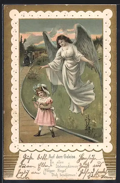 Lithographie Auf dem Geleise..., Schutzengel über einem Mädchen vor der Eisenbahn