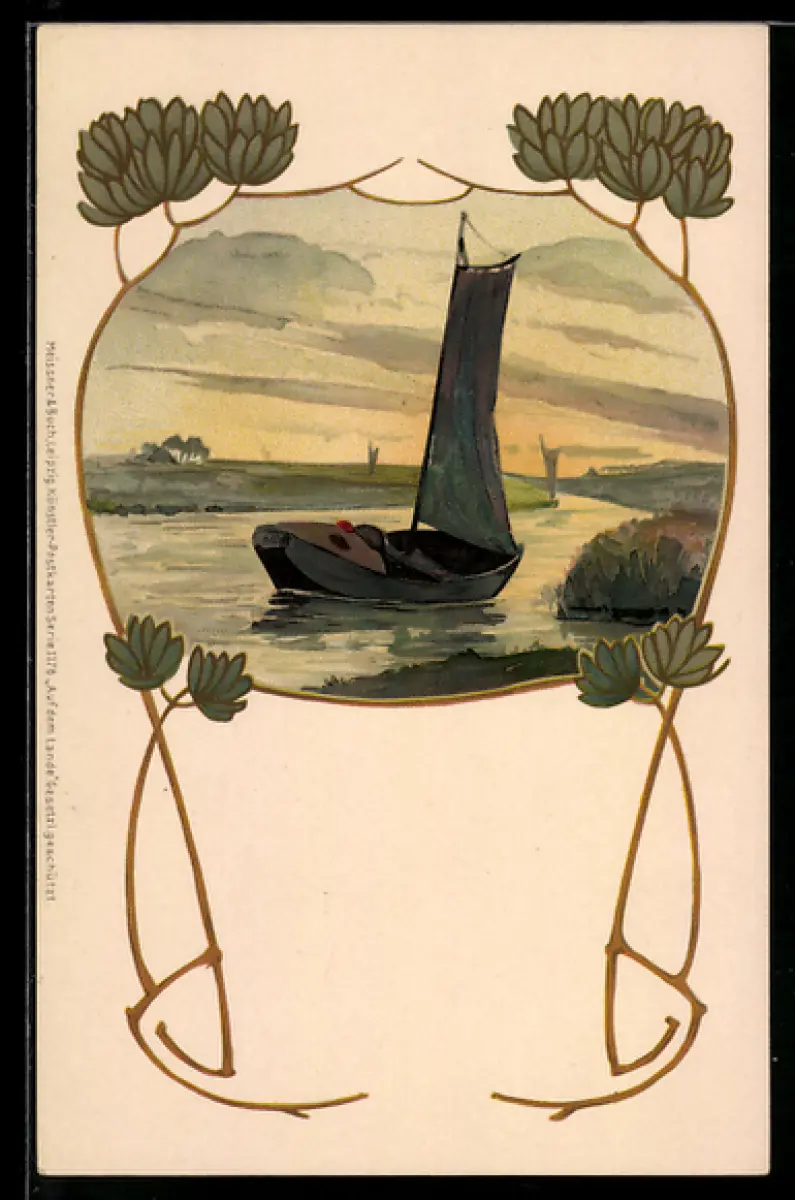 Lithographie Auf dem Lande, Ruderboot, Jugendstil