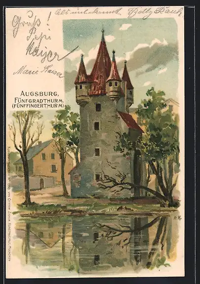 Lithographie Augsburg, Fünfgradturm, Fünffingerturm