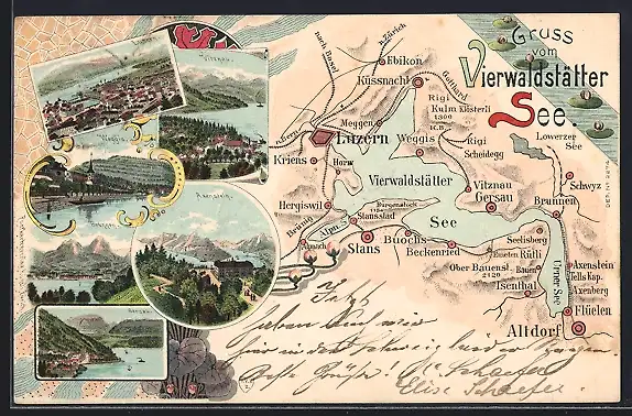 Lithographie Axenstein, Landkarte, Vierwäldstätter See mit Weggis und Gersau