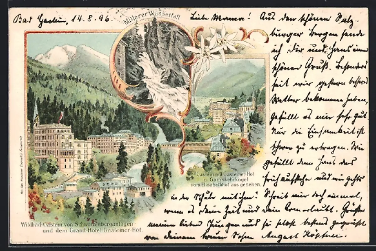 Lithographie Bad Gastein, Grand Hotel Gasteiner Hof, Mitterer Wasserfall