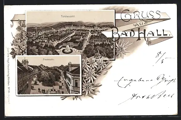 Lithographie Bad Hall, Strassenpartie in der Promenade, Totalansicht vom Zentrum