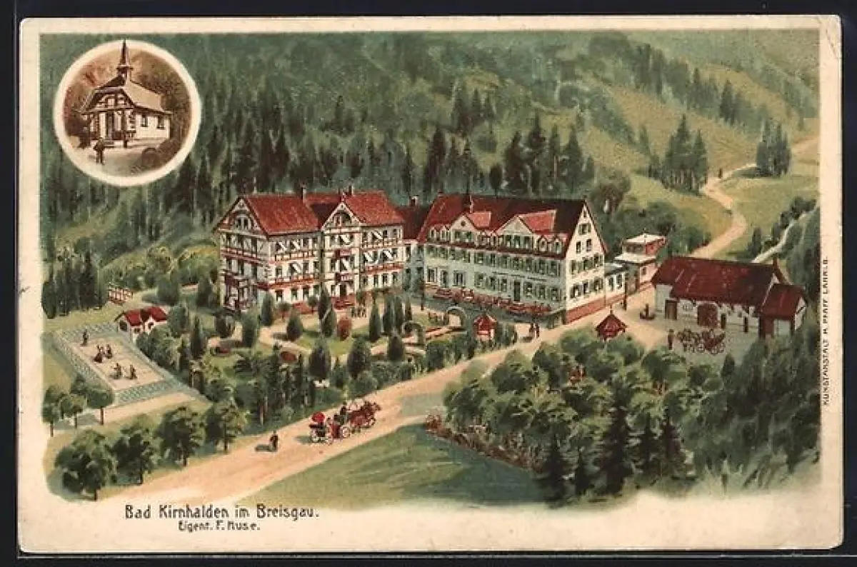 Lithographie Bad Kirnhalden im Breisgau, Kurhaus, Eigent. F. Huse, Gartenanlage, Nebengebäude